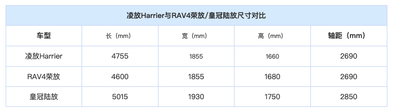 丰田将凌放HARRIER定位成了大五座外型SUV车型,现实上从保守的体型上而论,该车尺寸跟荣放十分接近,长宽高别离为4755/1855/1660mm,轴距为2690mm,两者的宽度、轴距连结了分歧,还近近达不到外型SUV的尺度。